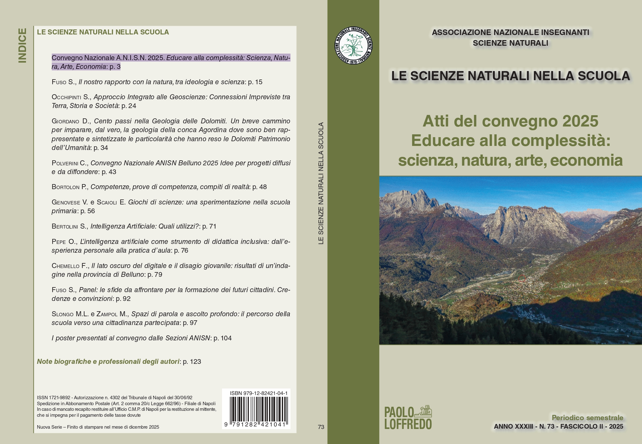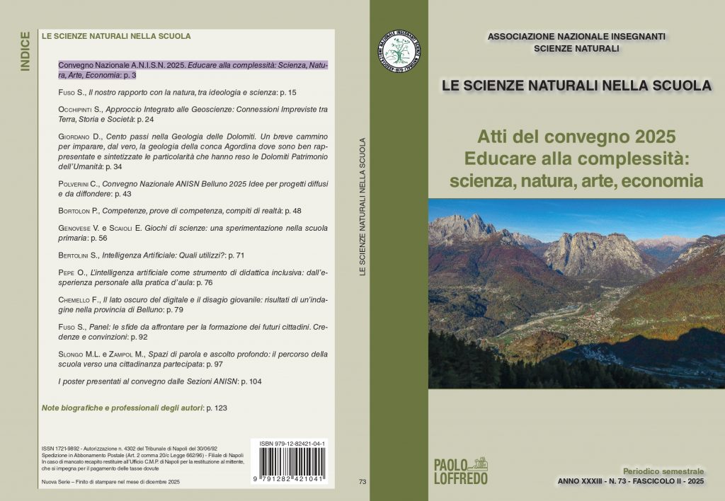 Il numero 73 della rivista è dedicato al Convegno Nazionale ANISN 2025 che si è tenuto dal 27 al 30 agosto 2025, tra Belluno, Agordo e Longarone. Il titolo:“Educare alla complessità: Scienza, Natura, Arte, Economia”. Gli argomenti trattati: 1) Apprendimento e strategie didattiche; 2) Rapporto Uomo -Natura; 3) Natura Amica o Nemica; 4) Intelligenza artificiale e Digitale Integrato. Il numero si apre con una introduzione di P. Bortolon. A seguire l’ intervento di Silvano Fuso che affronta il nostro rapporto con la natura tra ideologia e scienza e in particolare si sofferma sulla differenza tra l’ecologia di superficie e l’ecologia profonda, due modalità diverse di porsi nei confronti della Natura. L’articolo di Occhipinti: Approccio Integrato alle Geoscienze: Connessioni Impreviste tra Terra, Storia e Società affronta interessanti aspetti interdisciplinari applicati allo studio delle Scienze della Terra con riferimenti storici inediti. Danilo Giordano ci guida in un’escursione nella conca Agordina, una valle dolomitica affascinante da cui è possibile osservare i caratteri fondamentali delle maestose Dolomiti. Vale allora la pena percorrere, insieme all’autore, I cento passi di cui parla nell’articolo, per imparare dal vero la geologia di questi luoghi incantati. Il contributo di Polverini è centrato su alcune proposte di progetti didattici da applicare; si va dall’approccio STEM/ STEAM al progetto Letture di Scienze,alla didattica Outdoor. Paola Bortolon concentra il suo intervento sul concetto di competenza e sulle attività da suggerire per svilupparla a un buon livello, specialmente per gli allievi che